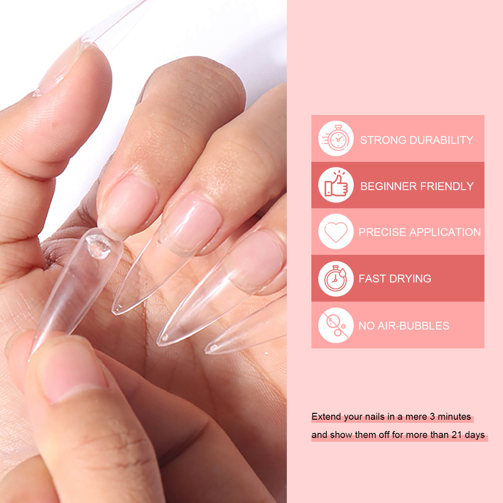 Therefore, a high-quality glue can ensure your nails stay longer and stronger. What's more, its ingredients are natural resins and does not contain any harmful ingredient. So solid nail tips glue is what you really need.