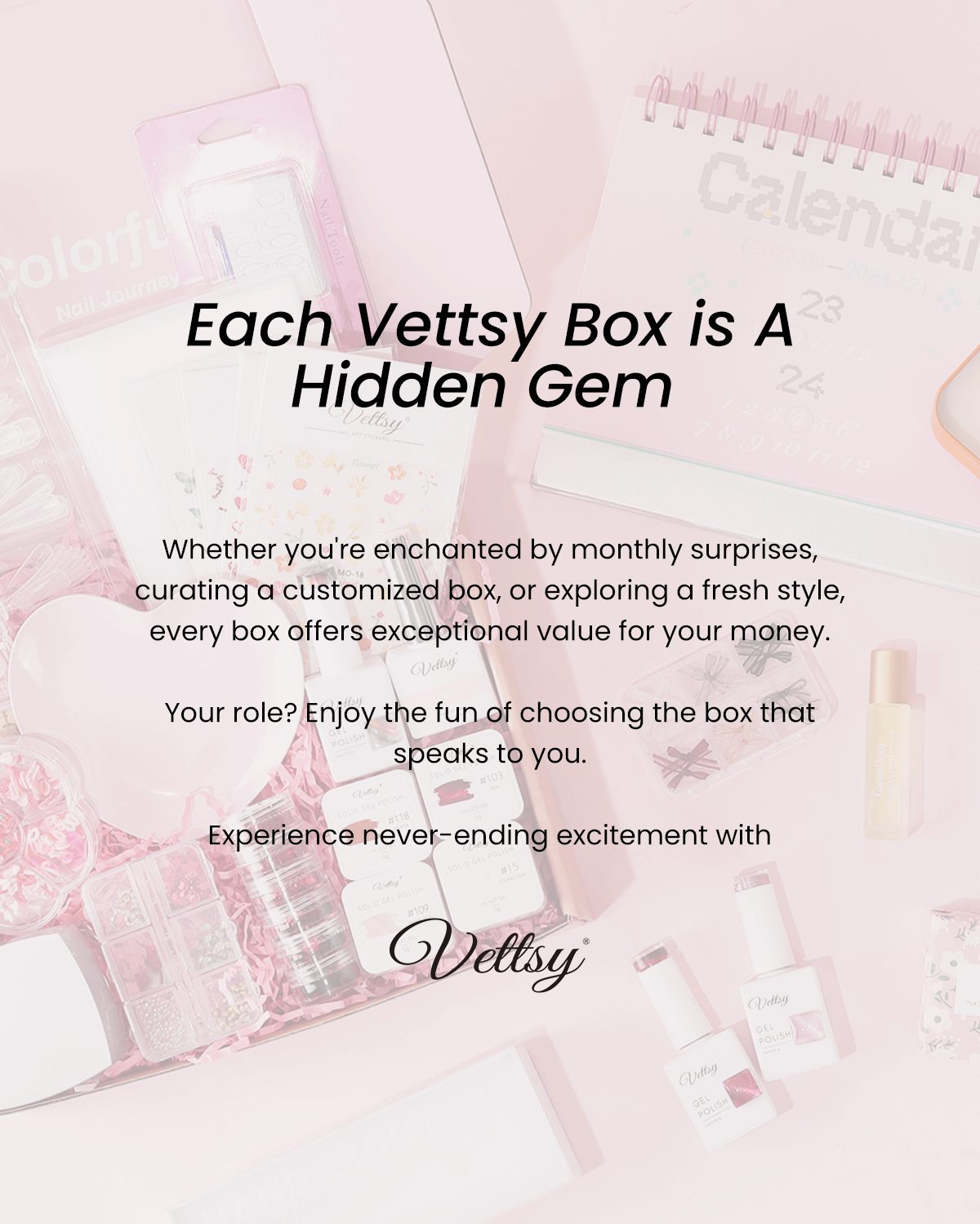 At Vettsy, we are dedicated to enriching your nail art experience. Whether you're a beginner or a professional nail artist, Vettsy Box provides the tools and inspiration to express your individuality and elevate your nail art game.