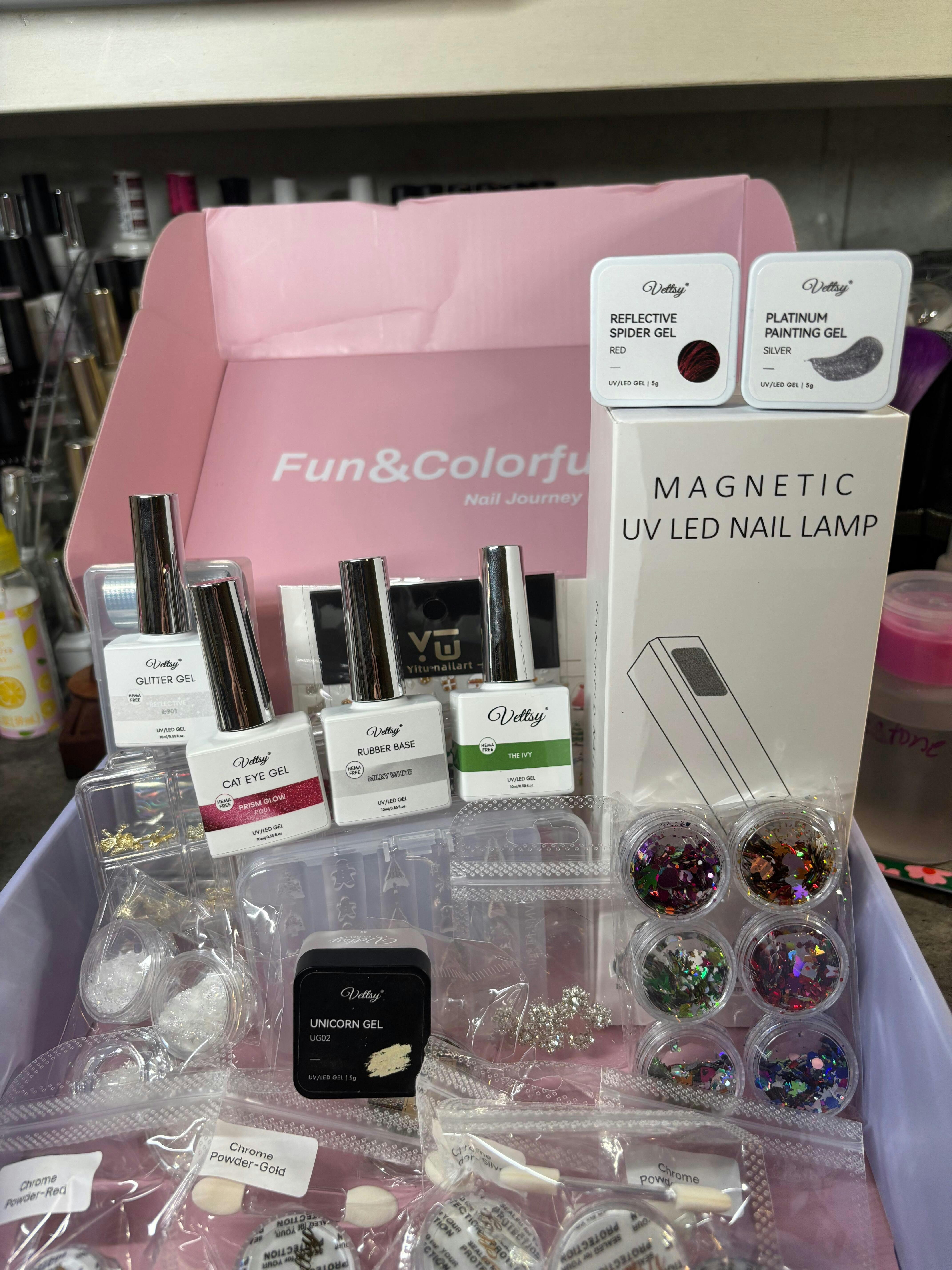 Gel Polish: Hema-Free Cat Eye Gel x 1, Hema-Free Color Gel x 1, Reflective Glitter Gel x 1, Rubber Base Gel x 1, Reflective Spider Gel x 1, Platinum Gel x 1